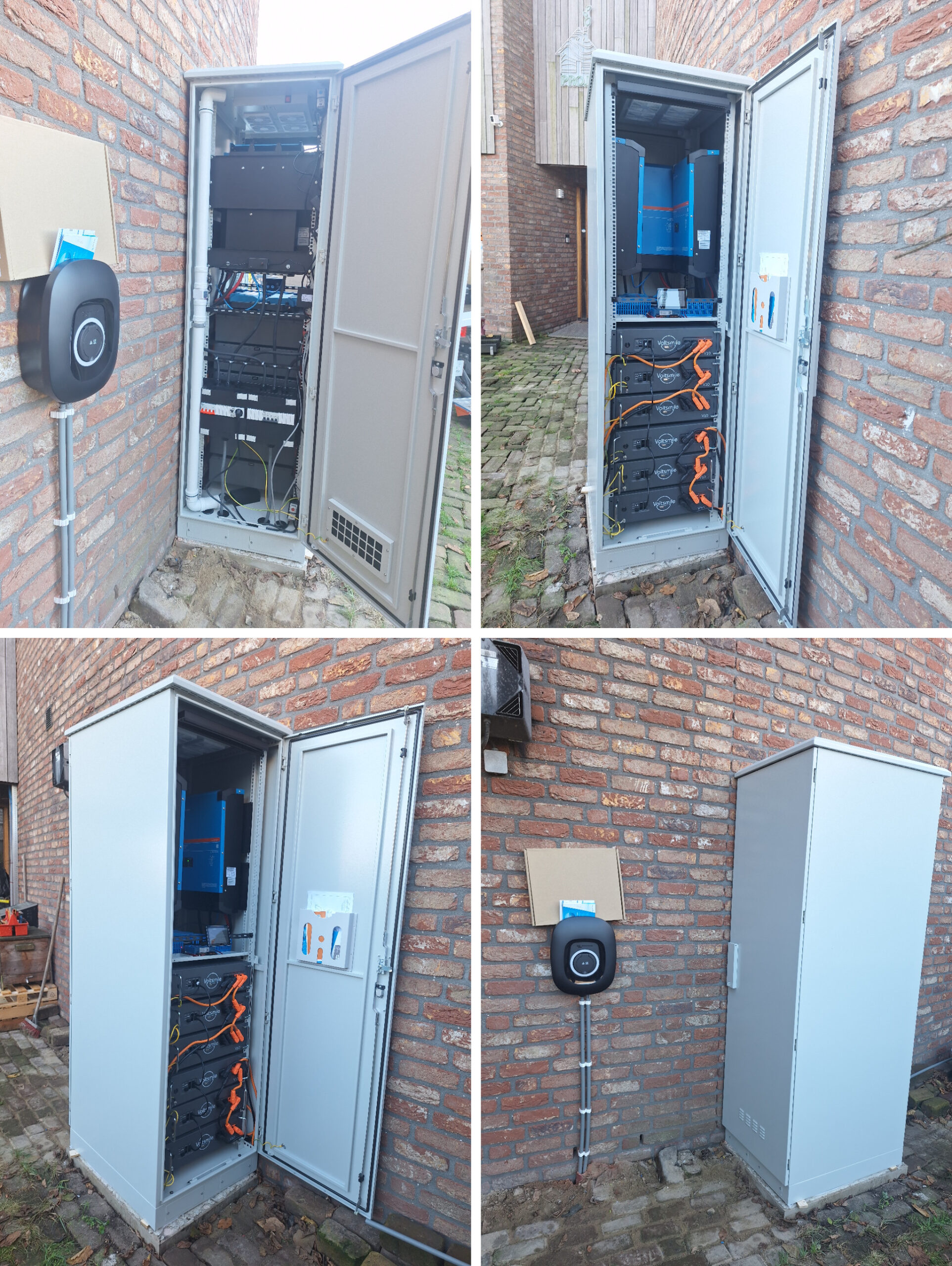 In deze robuuste buitenkast draait een krachtig Victron 3-fase systeem van 15 kVA, gekoppeld aan 30 kWh batterijcapaciteit. Dankzij een slim circulatiesysteem wordt de warmte van de omvormers optimaal benut om de kast op temperatuur te houden.