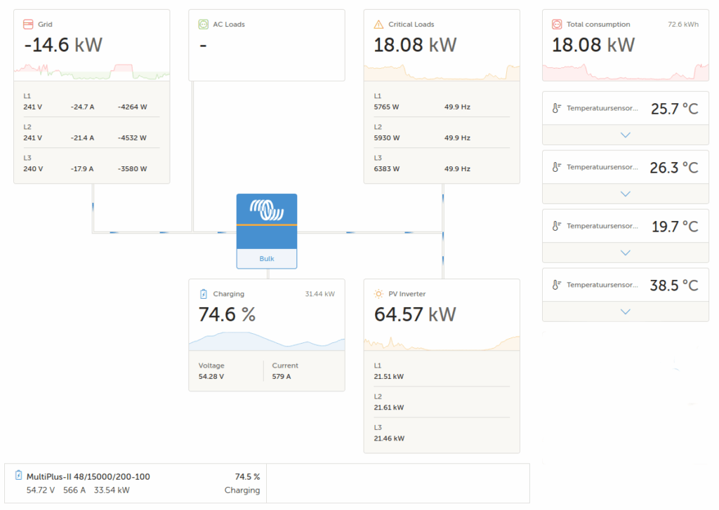 Zo ziet een zonnige dag eruit. Waarbij er verbruik is (18.08), zonnestroom (64.57), de batterijen worden geladen (74.6) met 566A. Zodra de batterijen vol zijn worden de zonnepanelen omvormers terug geregeld zodat er maximaal 17.250W wordt teruggeleverd. Het maximale wat op een 3x25A aansluiting mogelijk is.