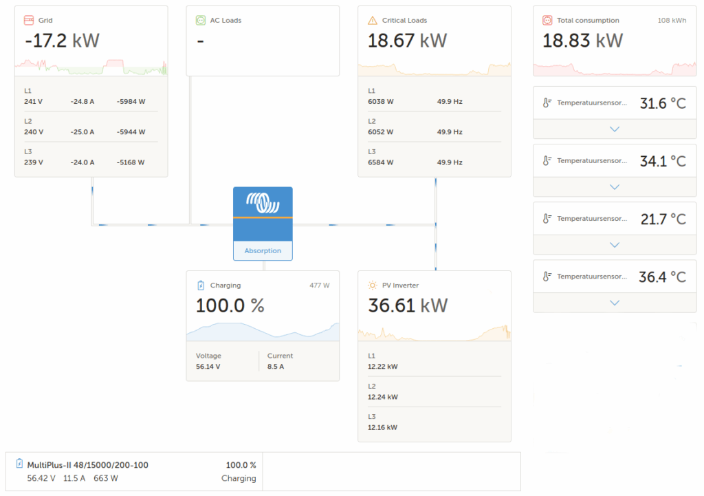 Een boerderij met in totaal 77kWp aan zonnepanelen en een oorspronkelijke 3x80A netaansluiting is succesvol teruggeschakeld naar een 3x25A aansluiting. Dit werd mogelijk gemaakt door het plaatsen van een Victron ESS-opslagsysteem van 45kVA / 100kWh.